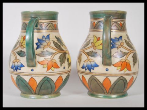 A pair of Art Deco Charlotte Reid for Crown Ducal handled vases of waisted form, pattern no. 5983, having tube lined floral decoration in green and orange hues with handles. Measures 17cm high.