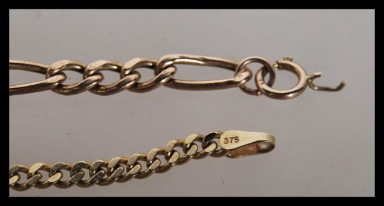 2 9ct gold ladies bracelet chains to include a figaro linked chain and an Omega linked chain. Each measure approx 7" long both with c-clasp's. Total weight 5.92g