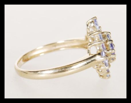 A hallmarked 9ct gold ladies cluster ring prong set with lilac stones in a geometric formation. Hallmarked Birmingham 2007. Weight 2.2g. Size O.