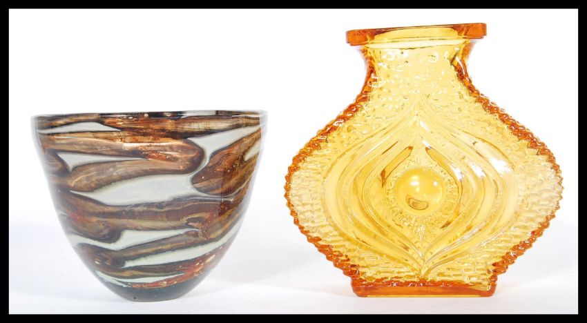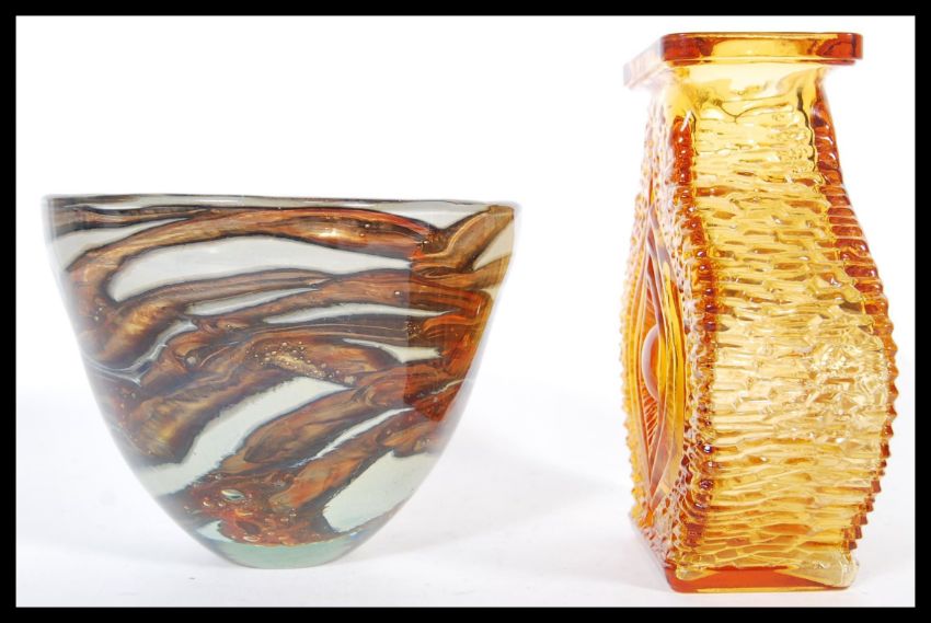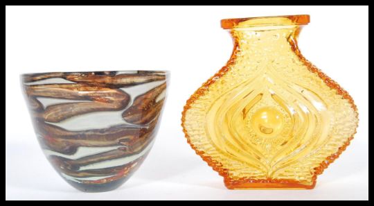 Mdina  Maltese retro vintage studio art glass bowl / vase, the swirls with an unusual gradient amber to the inside after a design by Michael Harris. Together with a orange coloured 'Eye vase' by Oberglas Austria. Measures 10 cm high x 13 cm diameter.