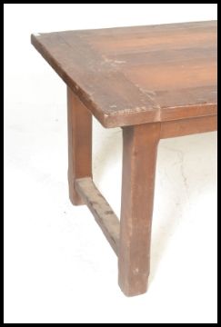 A 20th Century French oak extendable  refectory dining table, the solid rectangular top with rounded corners, raised on square supports and conforming stretcher together with two leaves. Measures 76cm high x 220cm wide x 85cm depth.