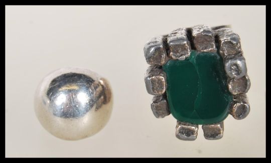 A selection of silver rings to include a stamped 925 ring having pierced decoration set with a grey stone, a stamped 925 silver ring having pierced decoration scrolled shoulders, a stamped 925 domed head ring and an unusual large Danish design dress ring set with a green stone in a decorative setting being marked J Hull to the inside. Total weight 55.4g.