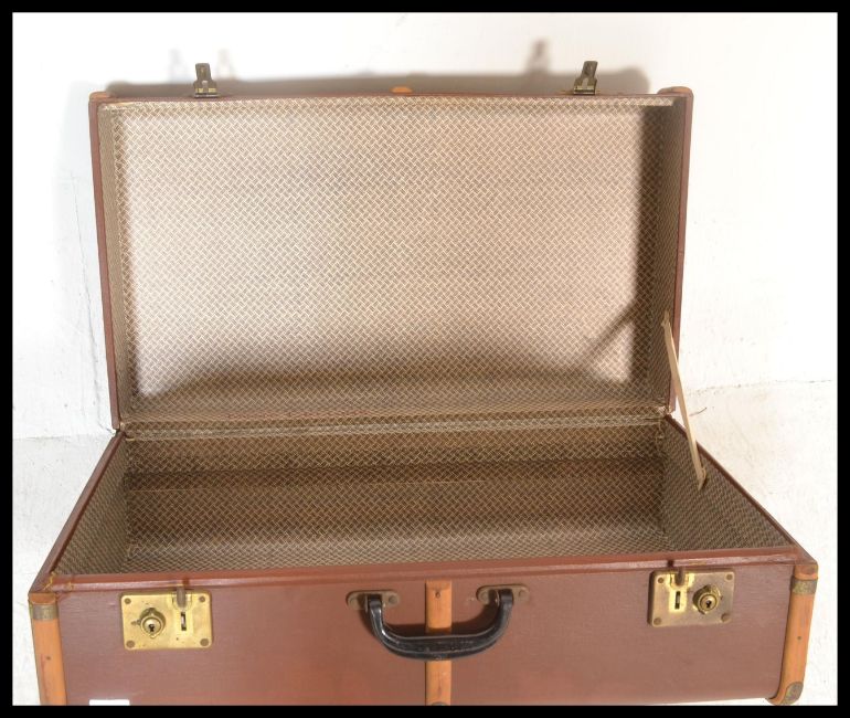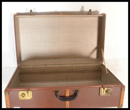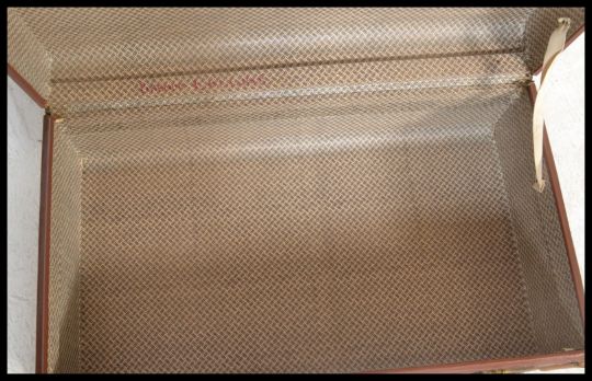 A vintage 20th Century canvas and cane bound steamer trunk, hinged top with latches to the front and leather carry handles to the side. Measures 28cm high x 76cm wide x 43cm depth.