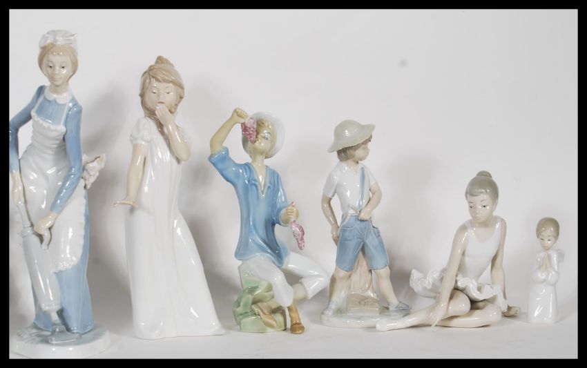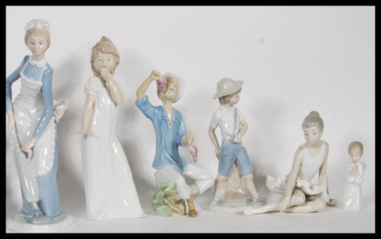 A group of ten 20th Century Spanish Nao ceramic figurines to include: ''So Shy'' , ''Seated Ballet'' , '' Turned duck'' , etc... Measures 32cm high.