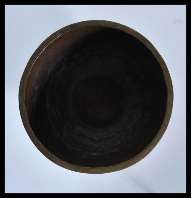 An early 20th Century hand worked buddhist  brass temple bowl of globular form, raised on a circular carved socle base.Measures 15cm wide.
