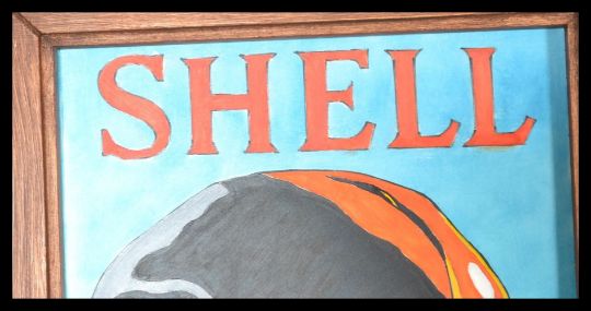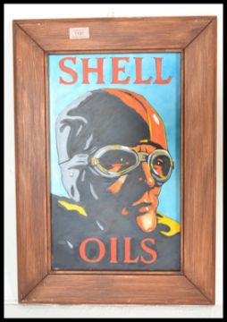 A contemporary artists impression of a vintage enamel advertising sign for Shell Oils, the representation painted on board with notation for Shell oil set around the bust of a racing driver. Measures 58 cm x 40 cm.