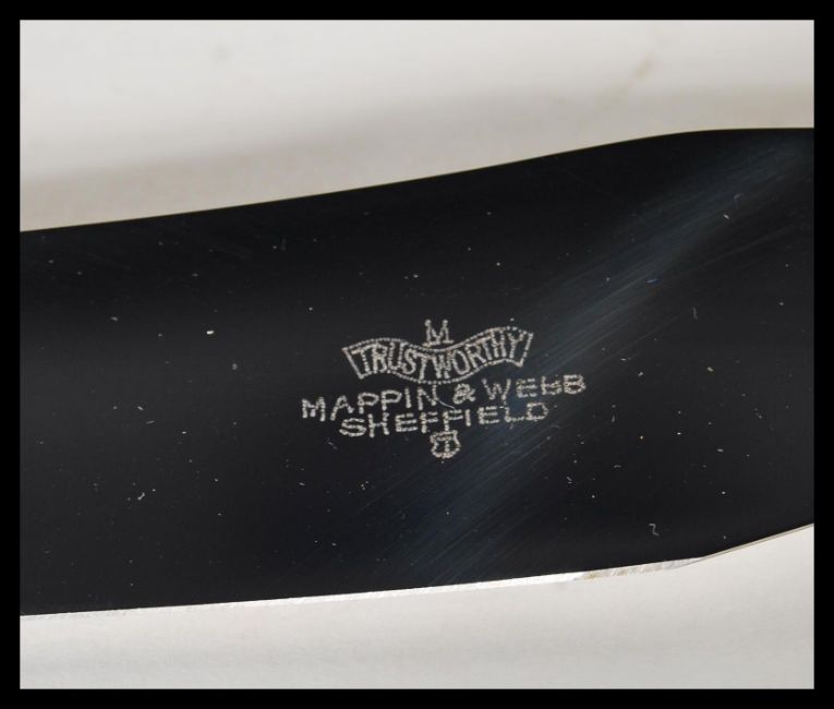 A Mappin and Webb cased three piece horn / antler handled carving set, consisting of a carving knife, meat fork and a steel.Measures 4cm x 42cm x 15cm.