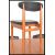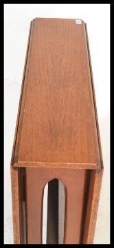 A retro 20th century teak wood drop leaf leg dining table together with a set of four matching dining chairs, the chairs with black vinyl seat pads and backrests raisedon teak frames. Measures 73cm high x 83cm wide x 24cm depth