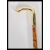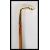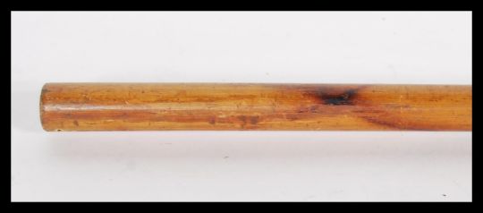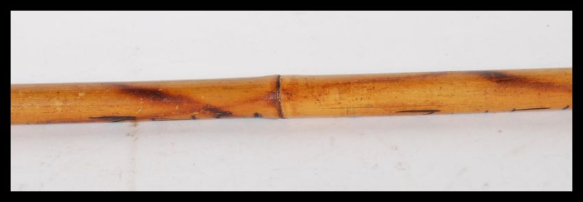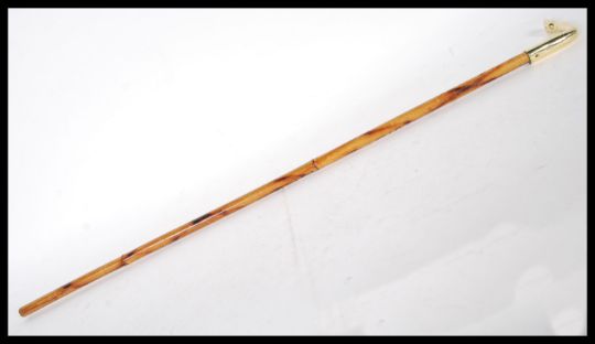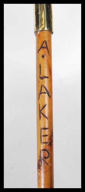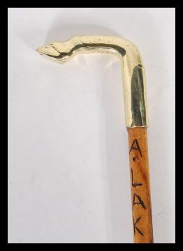 A walking stick cane having a brass horse hoof/ foot top on a bamboo shaft, having carved wording.