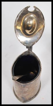 A set of three Jays silver condiments to include pepperette, table salt with a blue glass liner and mustard pot. Hallmarked Chester 1922. Silver weight 209.5g.