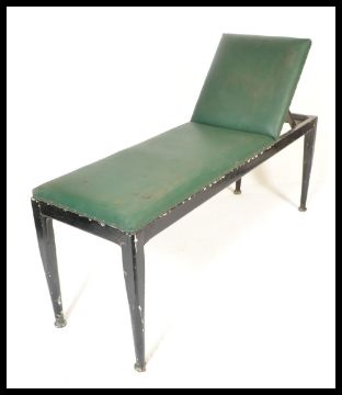 An early 20th century antique pine framed medical doctors examination table / couch / bench. The Examining table being adjustable to one end upholstered in a leatherette material raised on an ebonised pine frame. Measures 78cm high x 58cm wide x 183cm depth