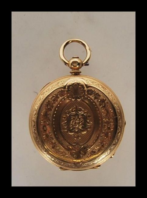An early 20th Century stamped 18ct gold cased hunter pocket fob watch having a floral engraved case with cartouche to the front engraved AL, with a gilt face having Roman numerals to the chapter ring. Inside of the case marked JL 18k 32649. Set within a vintage Bell & Son