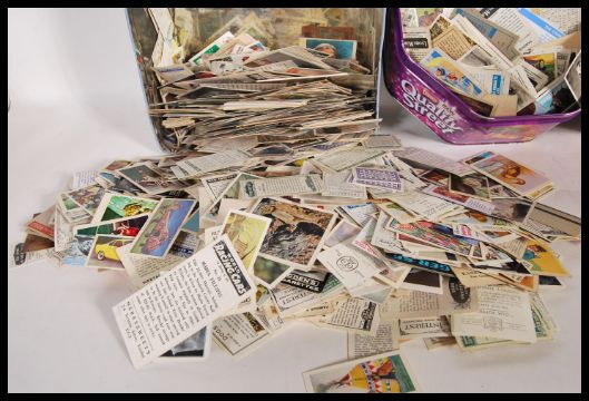 Cigarette / Trade cards with Tea and other issues. Many thousands of loose - completely mixed / unsorted issues in three old biscuit tins.