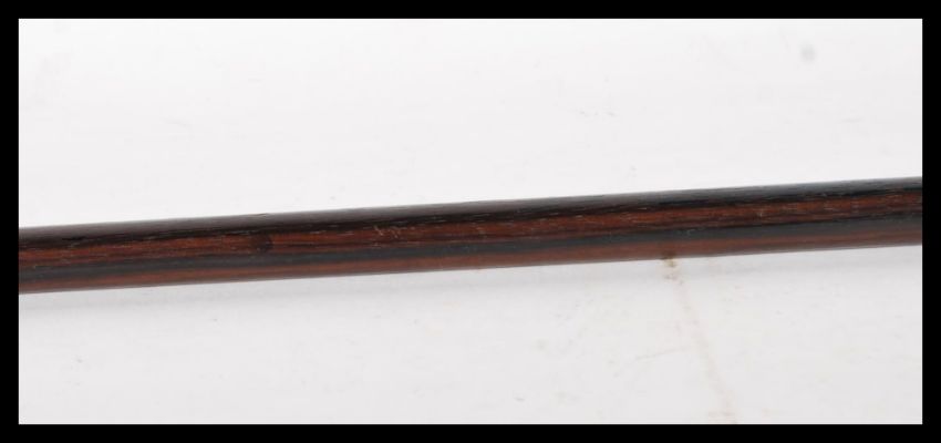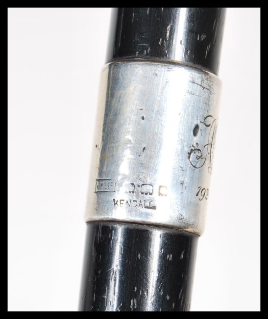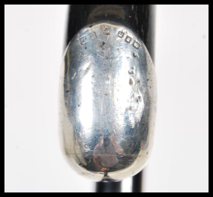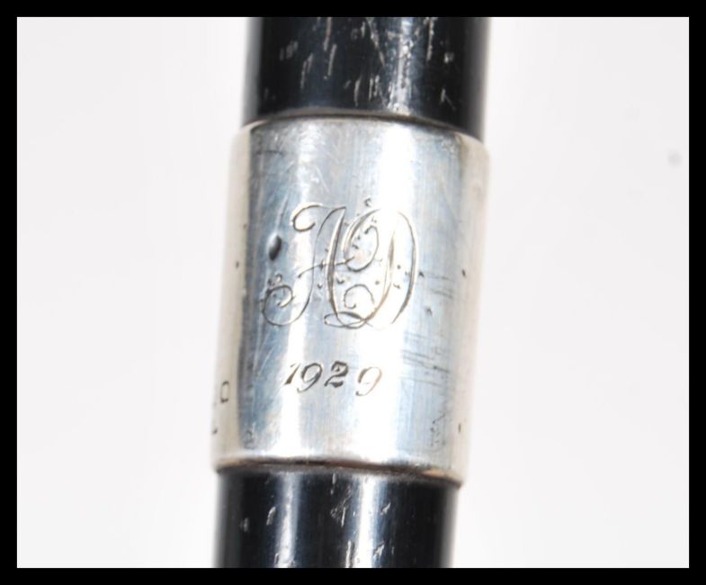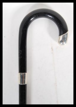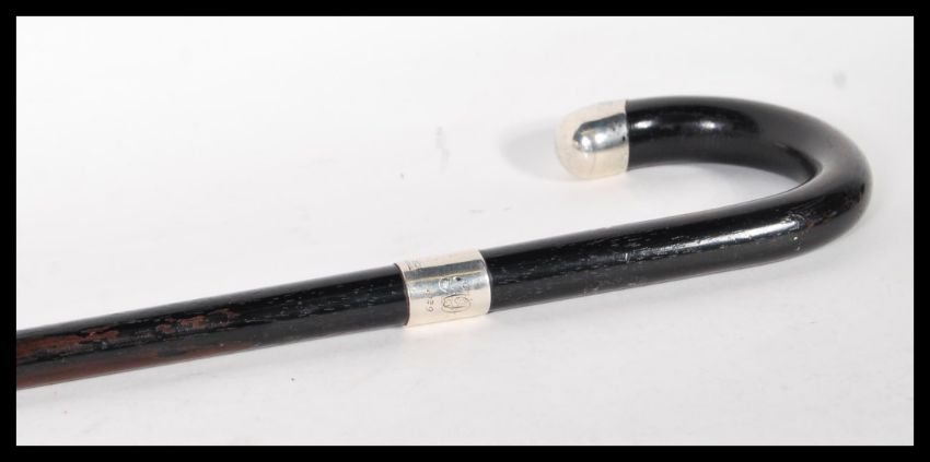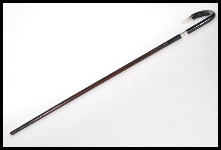 A early 20th Century crook handle walking stick/ cane, having ebony tapering shaft with hallmarked silver collar and tip. Hallmarked for London date letter N 1929, engraved monogram AD 1929.Measures 88cm wide.