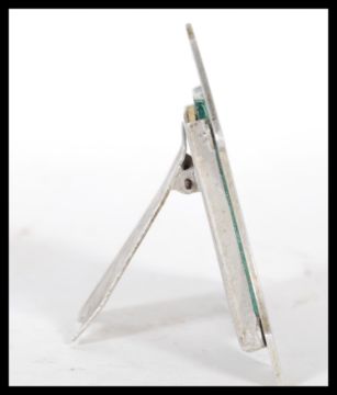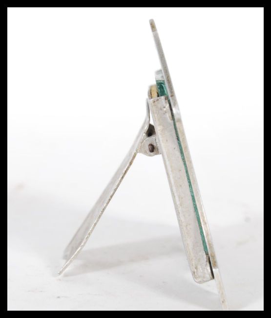 A Royal Flying Corp ( RFC ) World War 1 ( WW1 ) aluminum Trench Art easel picture frame, having chase decoration with Royal Flying Corp logo to top and "PER ARDUA AD ASTRA ( Through Adversity To The Stars ). The photo within the frame depicting a RFC WW1 crash sight, showing a Sopwith pup/ camel upside down in a vegetable patch, with the family and two men in uniform stood in front of the plane, one possible being the pilot. The frame itself believed to be constructed from the aluminum taken from the plane.Measures 7cm x 9cm.