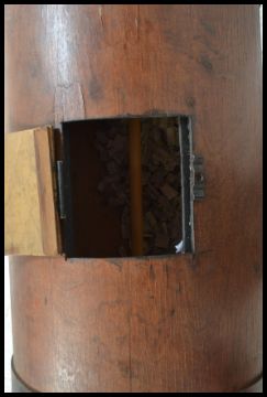 An original vintage mid century Tombola machine of wooden construction raised on H wooden base with Pained Lucky Tombola lettering to cylinder. Measures 19cm high x 65cm wide x 40cm depth