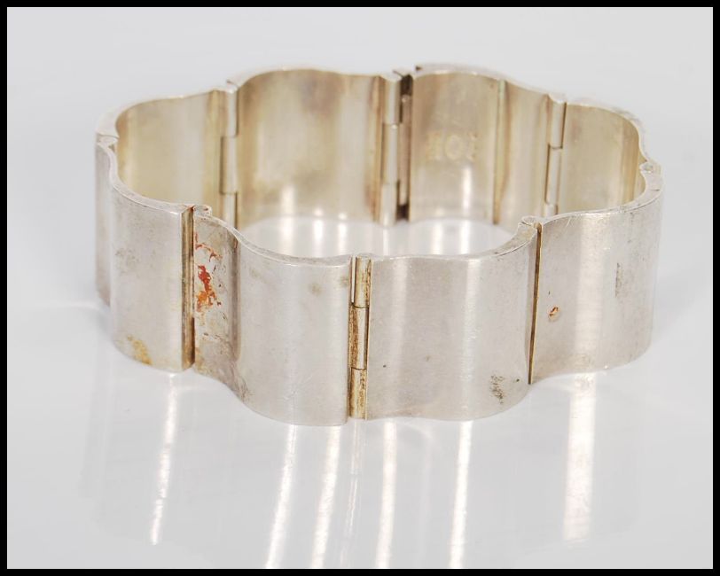 A Georg Jensen stamped 925 silver curved panel bracelet. Measures 3.5 inches wide. Weight 78.6g.