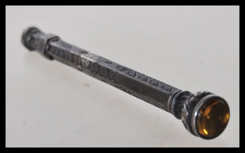 A vintage 20th Century silver white metal propelling pencil having engraved decoration and set with a yellow to top. Together with a ladies cheroot case and a small travel tool, in a white metal case.