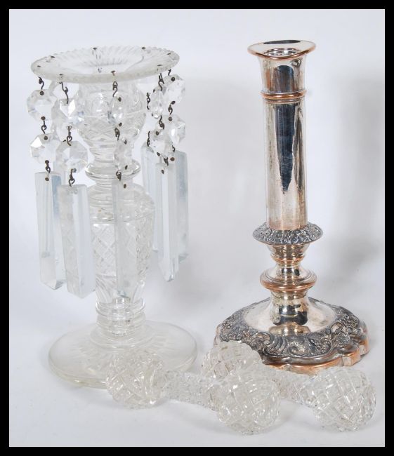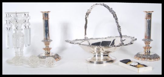 A good 20th century silver plated Walker & Hall bon bon dish of large form having pierced details stamped to base, arched handle together with silver plated copper candlesticks and glass facet cut knife rests.Measures 24cm x 30cm x 24cm.