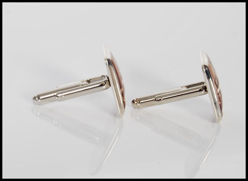A pair of sterling silver and enamel cufflinks depicting an erotic scene involving a nude lady. Weighs 12.7g.