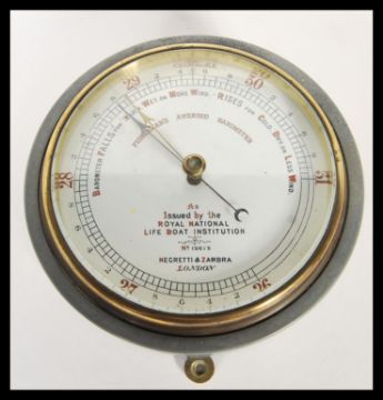 A vintage 20th Century Negretti & Zambra circular cased fisherman's aneroid barometer issued by The Royal National Lifeboat Institution R.N.L.I.