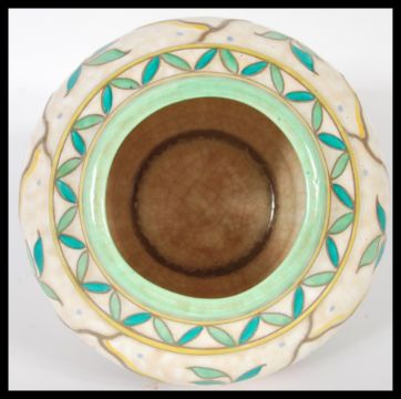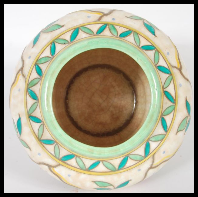 A early 20th Century 1930's Charlotte Rhead for Crown Ducal Trellis 6016 pattern flower vase, having floral sprays on a sand coloured ground with brown trellis design and green edges, ribbed body effect. Printed and impressed marks to base.
