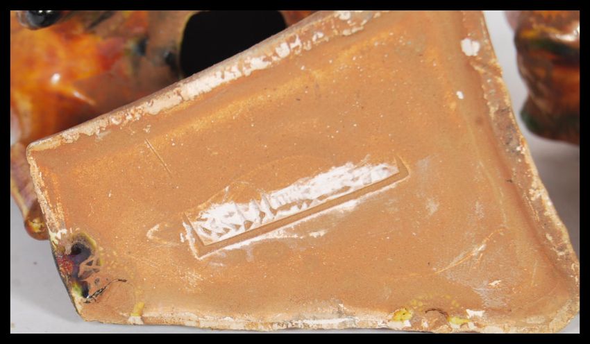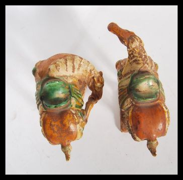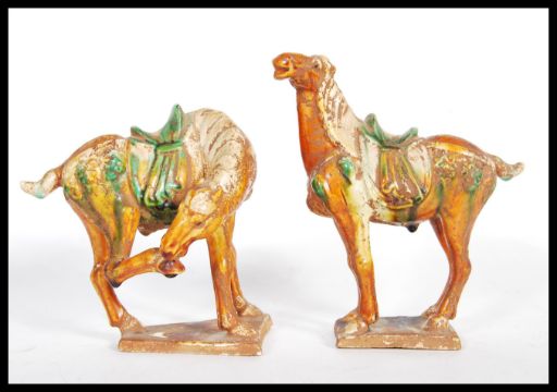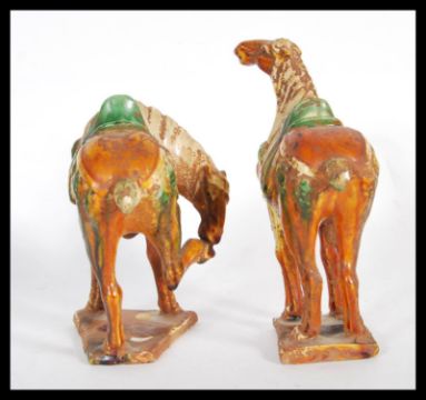 A pair of vintage 20th Century reproduction Chinese Tang dynasty ceramic War Horses. Having majolica style drip ware glaze. Impressed marks to base. Measures 15 cm high.