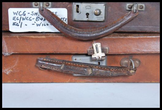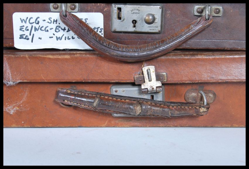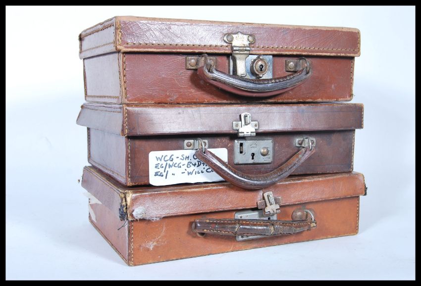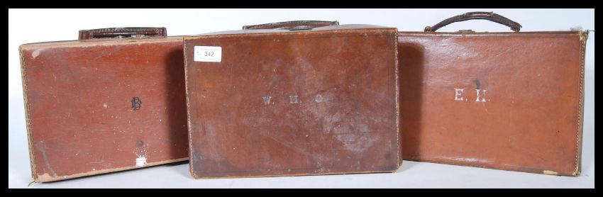 A selection of three vintage 20th Century brown leather travel briefcases having lined interiors with stationery fixtures, all having stamped initials to the tops.Measures 8cm x 30cm x 21cm.