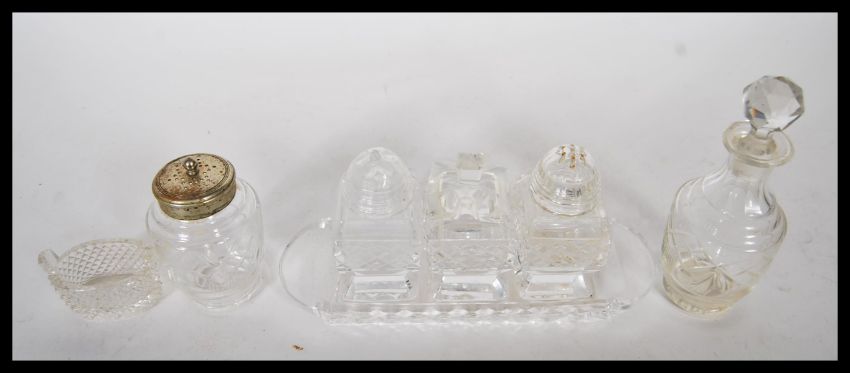 A collection of 20th Century cut glass cruets to include a three part cruet set consisting of salt, pepper and mustard pot within a fitted tray, a waisted perfume bottle with a cut glass stopper, a pepperette with a silver plated lid and another small cut glass table salt in the form of a basket.