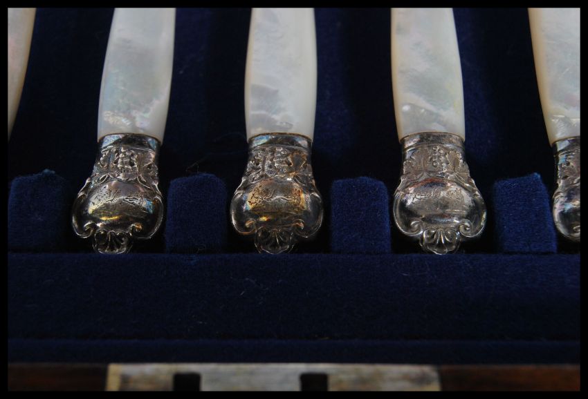 A 19th Century Victorian Henry Wilkinson & Co silver cutlery canteen with mother of pearl handles, set within a fitted walnut veneered canteen having an applied metal cartouche to the lid. Each piece is hallmarked for Sheffield 1870. The set includes nine knives and nine forks.