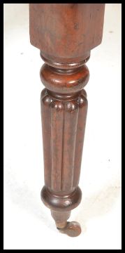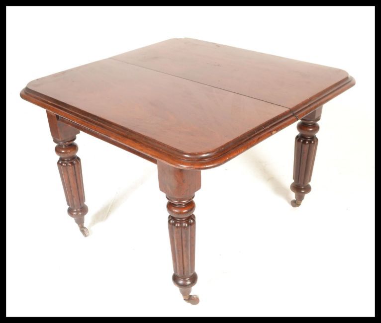 A 19th century Victorian mahogany extendable dining table, raised on fluted baluster legs terminating on ceramic castors. Measures 73cms high x 105cms wide x 105cms deep.