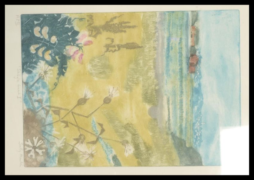 Sally Hunkin b. 1924 - Two coloured etchings entitled ' The Shingle Bank I' and ' The Shingle Bank II' depicting wildflowers on shingle landscapes, in muted green and yellow hues. Signed and numbered. Framed and glazed. Measures 63cm high x 48cm wide.