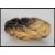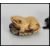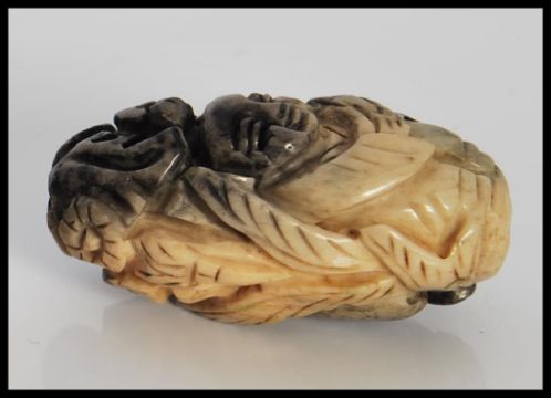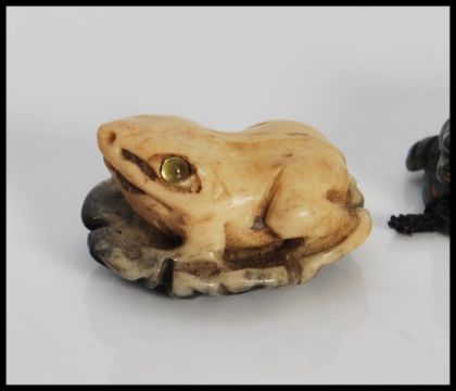 A group of four 20th Century Chinese carved toggles to include a green stone fu dog, a frog having glass eyes on a lily pad, a rabbit toggle having a pink stone eye and a toggle carved with two figures with musical instruments.