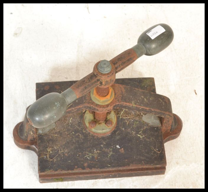 Book Binding Equipment - A heavy late 19th early 20th Century cast iron metal book press of typical form.