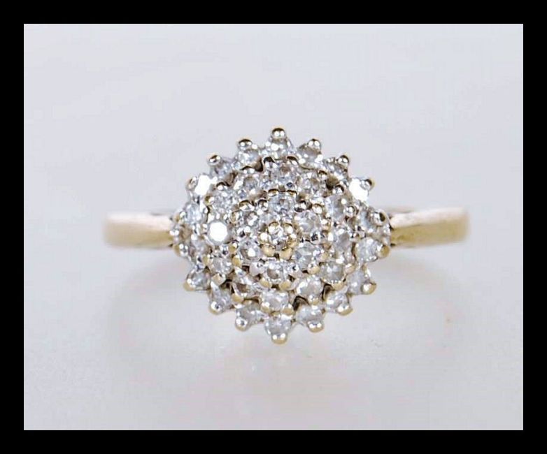 A hallmarked 9ct gold cluster ring set with white stones. Hallmarked Birmingham. Weight 2.0g. Size I.