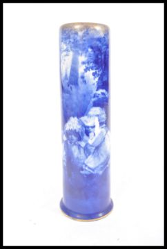 A 20th Century Royal Doulton tall stem vase in the Blue Children pattern transfer printed with two girls crouching down beside a tree to speak to a small fairy type creature along with a matching centrepiece dish with shaped scrolled rom and gilt detailing.