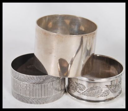 A collection of silver hallmarked items to include a silver collared perfume bottle, a silver hallmarked spoon and three non matching silver hallmarked napkin rings.