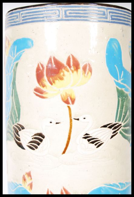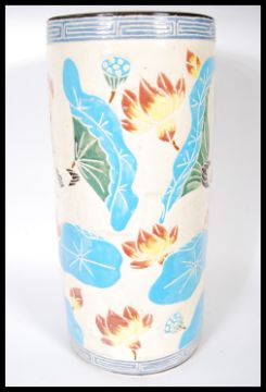 A 20th Century 1930's Art Deco Oriental ceramic cylindrical stick stand having lotus flowers, blue water lilies and swans throughout, with blue geometric borders. Impressed marks to base. Measures 50 cm x 23 cm.