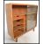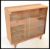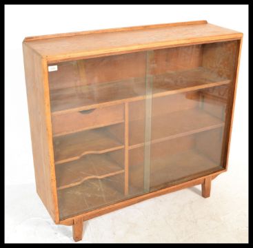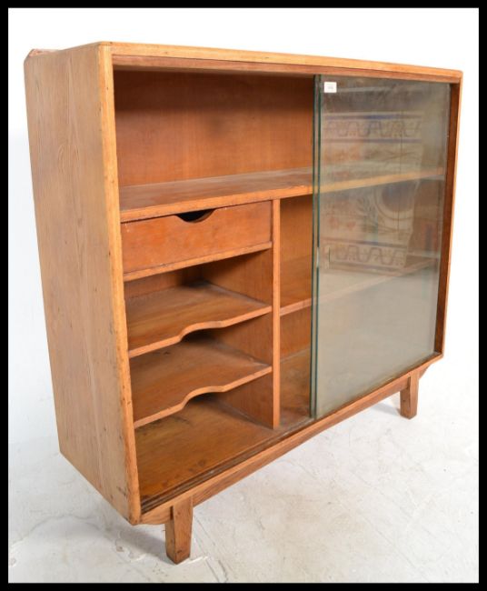 A mid century golden oak and glass display library bookcase cabinet having twin sliding glass doors housing an arrangement of adjustable shelves and drawers set within. Measures 102 cm high x 106 cm wide x 30 cm deep.