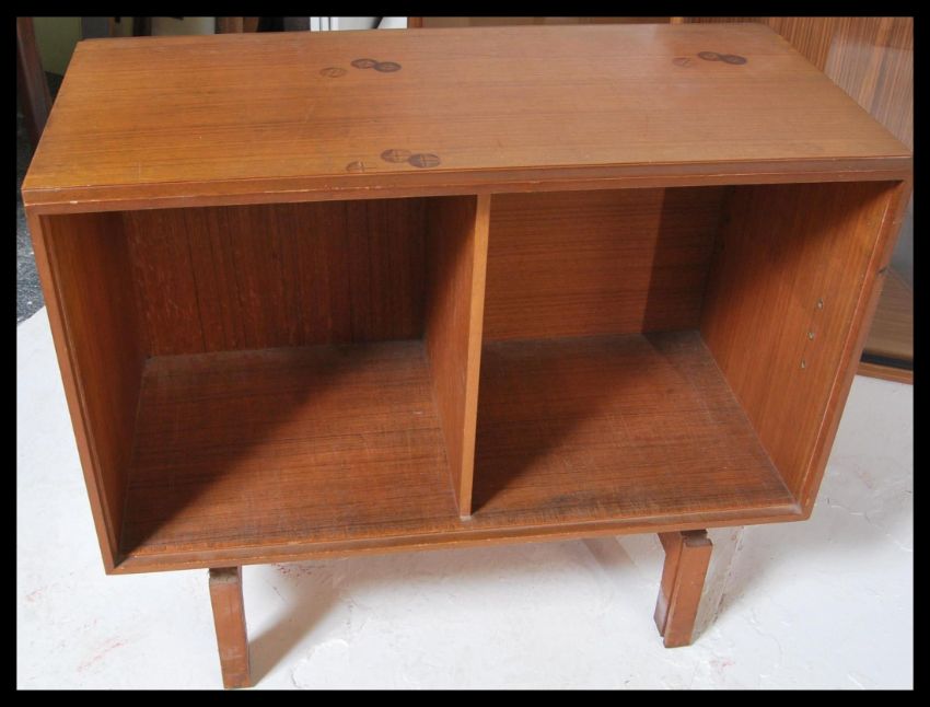 A pair of mid century retro oak sliding glass door bookcases together with a walnut glass bookcase cabinet, a teak open fronted shoe rack cabinet, a teak low cabinet with double doors and an open window teak bookcase. Measures 84Hx113Wx30D cm