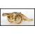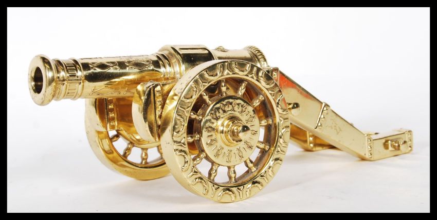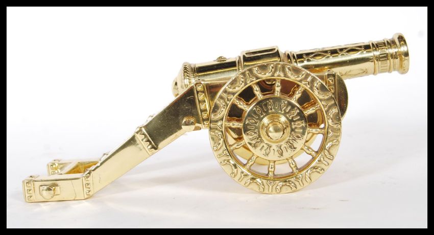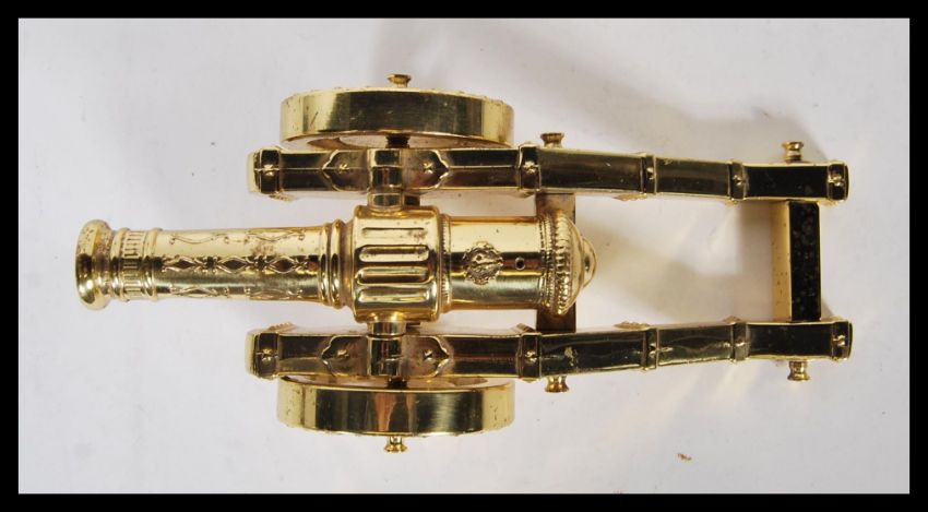 A 20th Century gilt brass desktop cannon ornament having twin wheels with raised garland decoration and support to the rear.