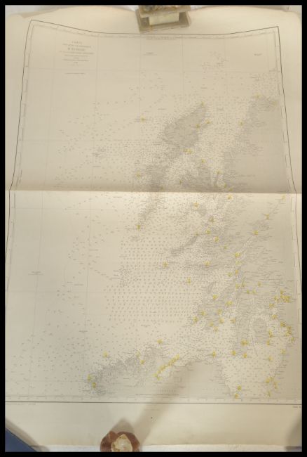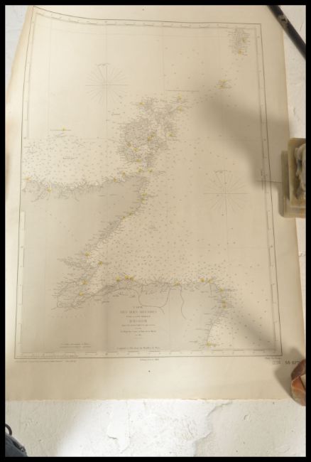 Four late 19th / early 20th Century marine charts showing some of the English and Scottish coast with lighthouses and lights added by hand colouring - to include' Orkney Islands and the North-East Coast of Scotland 1865', published by the French Depot des Cartes et Plans de la Marine and engraved by Jacobs April 1888 edition, 'West Coast of Scotland and the North Coast of Ireland 1865', published by the French Depot des Cartes et Plans de la Marine in April 1909, 'English Coast from Orfordness to Cromer' published by the French Marine Hydro-graphic Service 1898, A Map of the English Coast published by the French Depot des Cartes et Plans de la Marine, Paris 1875, updated to 1891 Plus a folding map published by Stanford of the English Channel.