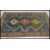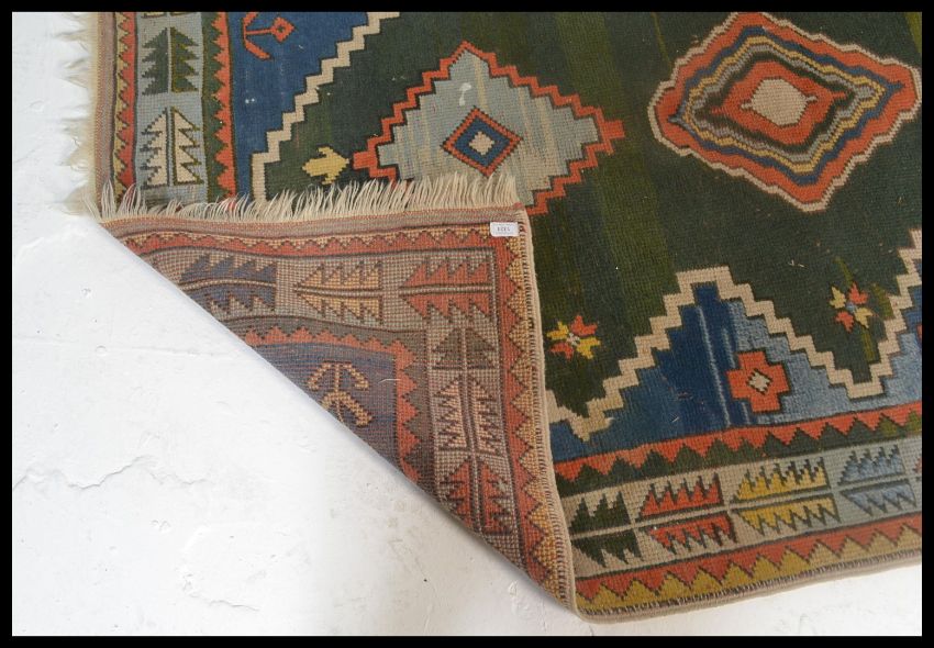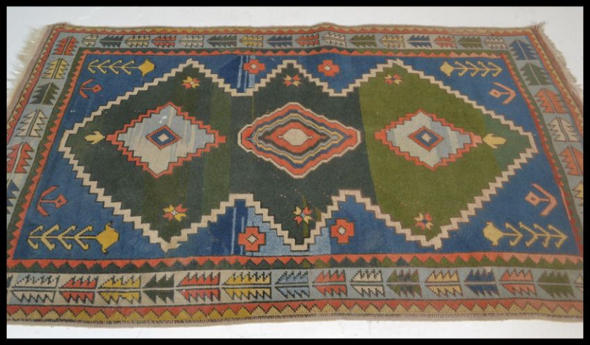 A vintage 20th Century oriental rug having green and blue ground, with geometric pattern border around three central medallions and tasselled ends. The dimensions are 210cm x 136cm.