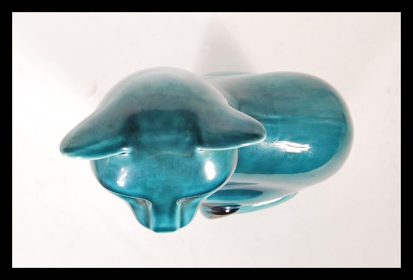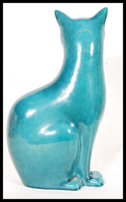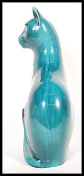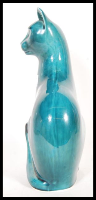 A Poole studio pottery ceramic figurine modelled as a seated cat with a turquoise glaze. Stamped to the base. Measures 30 cm High.