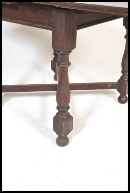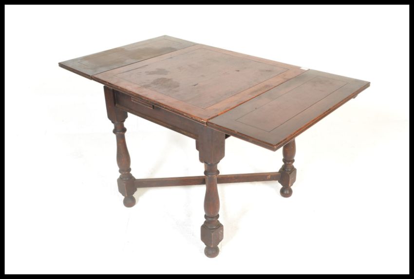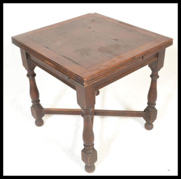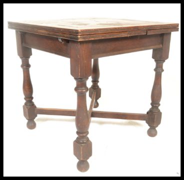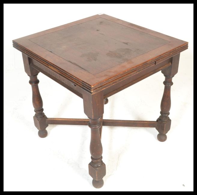 An early 20th century oak draw leaf dining table having,pull out leaves to each end being raised on turned supports united by cross stretchers. Measures 73cm high x 73cm wide x 75cm depth.