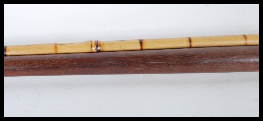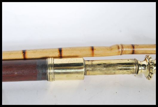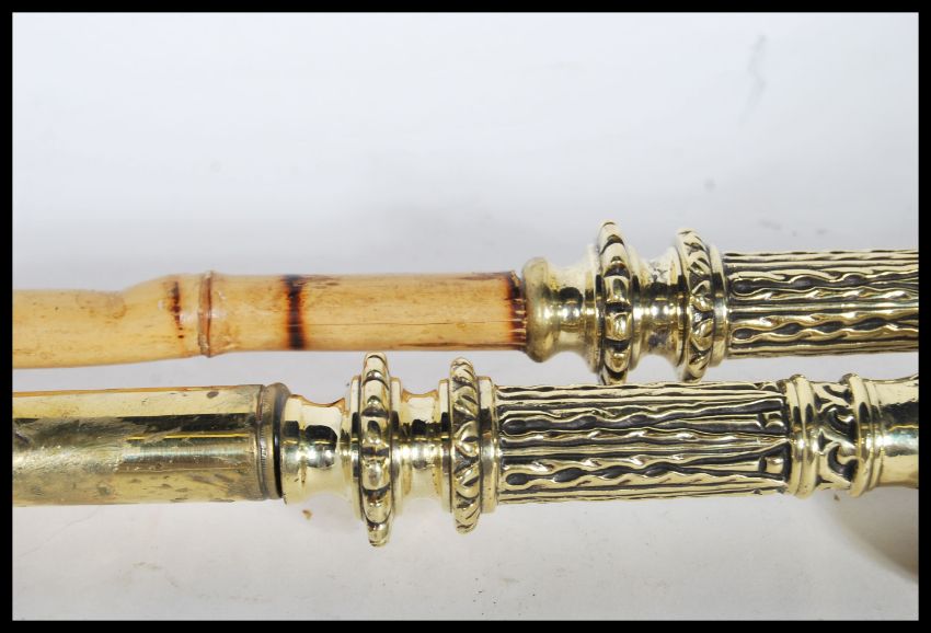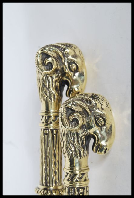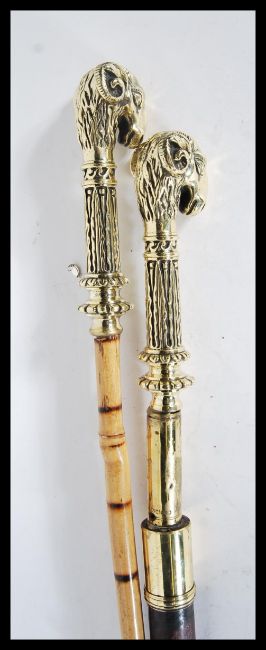 A pair of 20th Century walking sticks/ canes, one having a bamboo shaft with brass rams head a top with brass ferrule. Together with a tapering shaft and brass collared walking stick and rams/ goats head to top.Measures 92cm wide.
