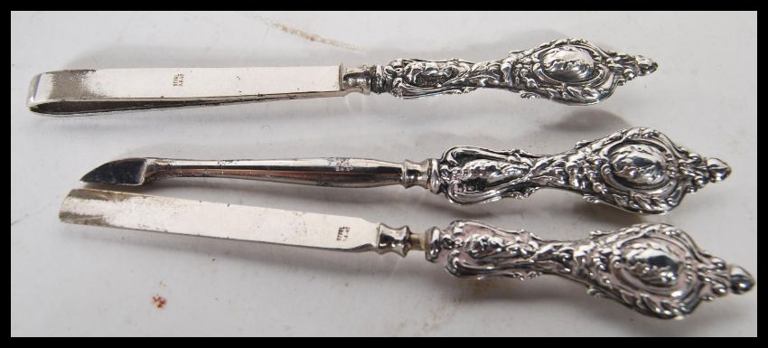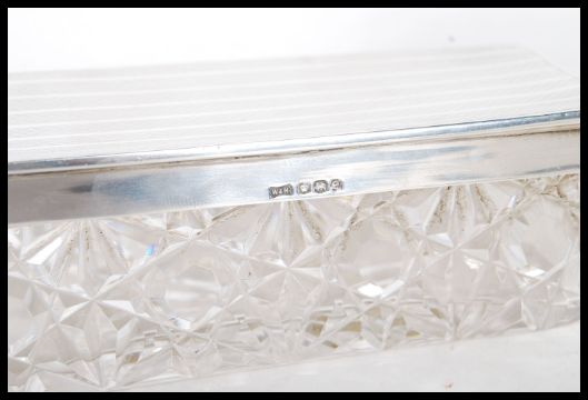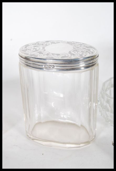 A selection of silver hallmarked dressing table items to include a Walker & Hall cut glass rectangular cut glass box with a silver lid with engine turned decoration( hallmarked Sheffield 1922) , a Wolfsky & co lidded table jar having a chamfered glass body with an engraved decoration silver lid (hallmarked 1896), a Samuel Levi manicure set having silver hallmarked handles (hallmarked Birmingham 1907) and a Henry Charles Freeman silver topped ink blotter having scrolled repousse decoration (hallmarked Birmingham 1903).