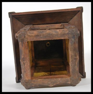 An early 20th Century Arts and Crafts influenced wooden porch lantern, colored glass circular panels under sloped panels.Measures 25cm x 21cm x 21cm.