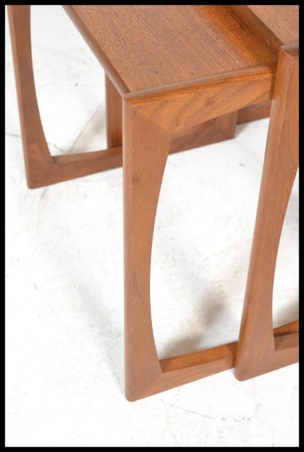 A G-Plan retro teak wood 1970's graduating nest of tables in the Quadrille pattern. The tables having angular legs united by reverse stretchers with graduating table tops above. Measures 49 cm high x 53 cm wide x 43 cm deep.