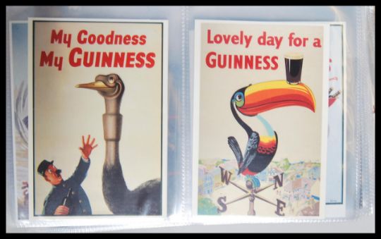 Guinness Breweriana. Box with album of vintage and more modern advertising postcards, beer mats, bar towels etc.